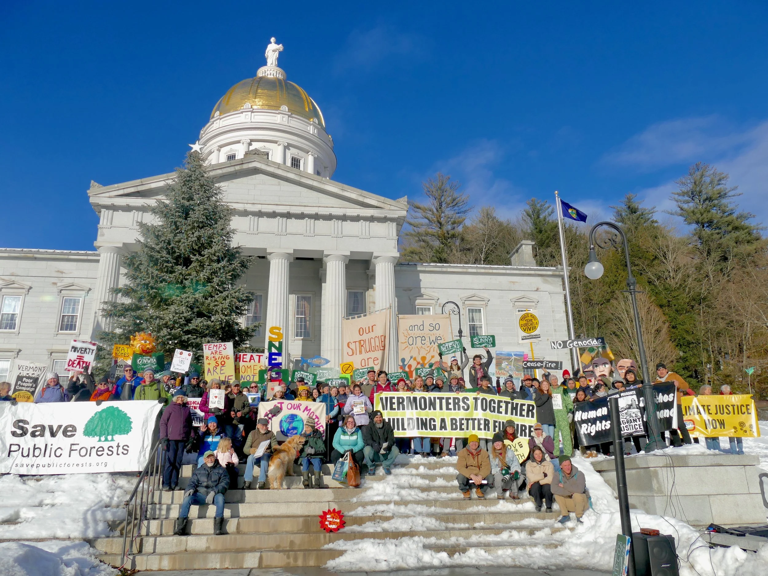 In the second half of the 2024-2025 legislative biennium, 350Vermont has been focused on holding the line on existing climate policy, supporting legislation from our coalition allies, and introducing and mobilizing around our ratepayer protection legislation (H.753). Other legislation we're supporting this session includes a moratorium on data centers (S.205), legislation to legalize plug-in solar in VT, supporting transit funding, and a slate of legislation put forth by the ACLU to protect Vermonters civil rights. Our volunteers have been active, meeting with their legislators, calling into the Statehouse, and working with their local groups to support and oppose a variety of bills. Sign up for our action alerts to get timely asks throughout the legislative session.