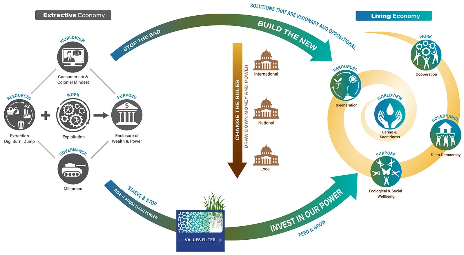 Our world is built on resource extraction, worker exploitation, and overconsumption; our economy prioritizes profits for the ultra-rich over the well-being of people and planet. True climate solutions must bring about a Just Transition to a regenerative economy that more fairly recirculates wealth, promotes the health and resiliency of communities and ecosystems, and provides jobs in sustainable stewardship and low-emissions energy.